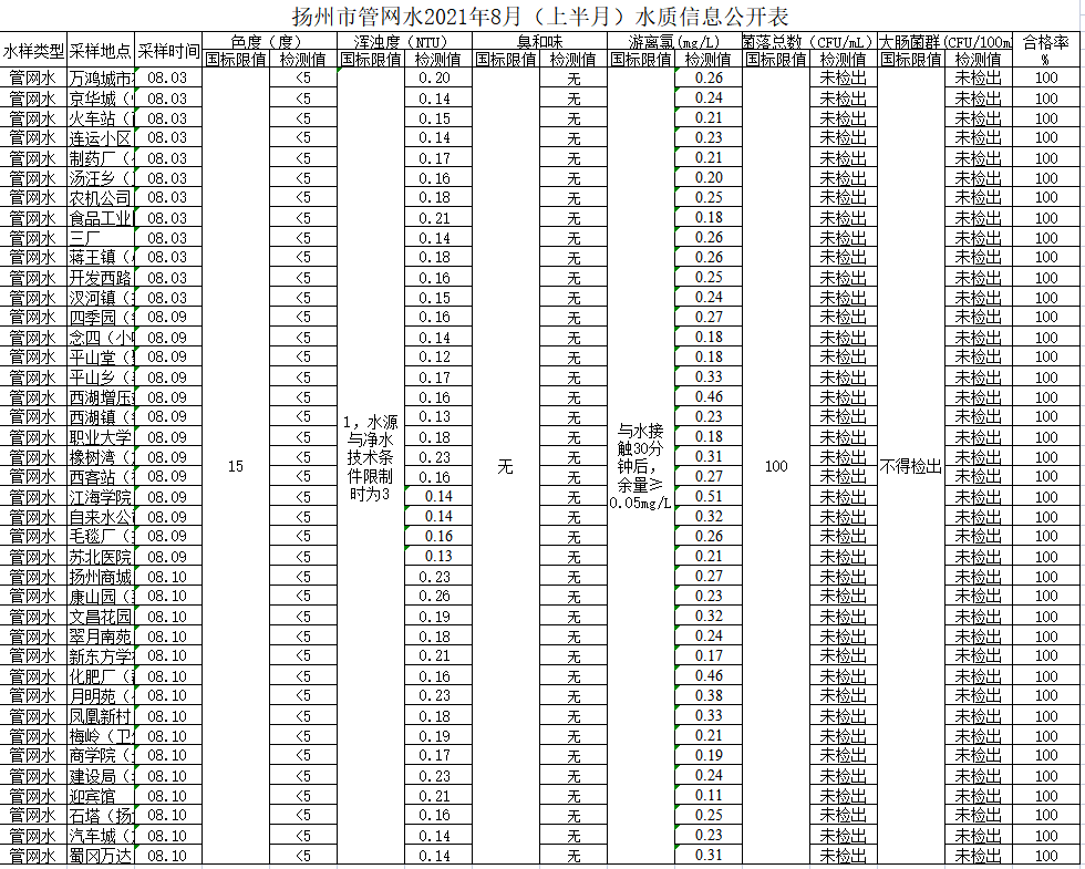 揚(yáng)州市管網(wǎng)水2021年8月(上半月)水質(zhì)信息公開(kāi)表