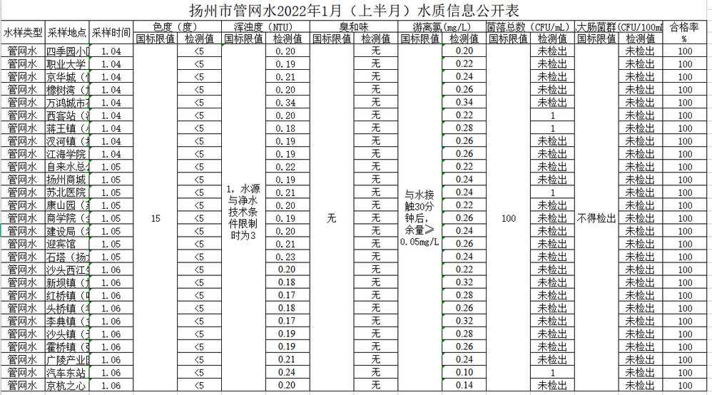 揚州市管網(wǎng)水2022年1月(上半月)水質信息公開表