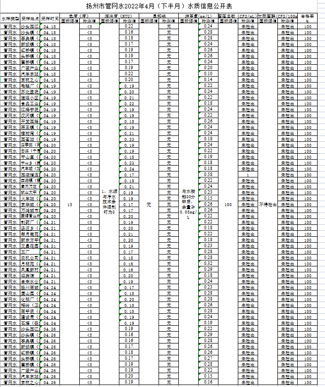 揚(yáng)州市管網(wǎng)水2022年4月(下半月)水質(zhì)信息公開(kāi)表