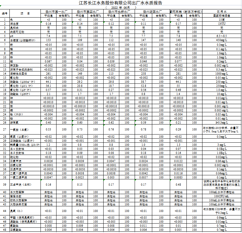 江蘇長江水務(wù)股份有限公司出廠水水質(zhì)報(bào)告 ( 2022 年 06月 )