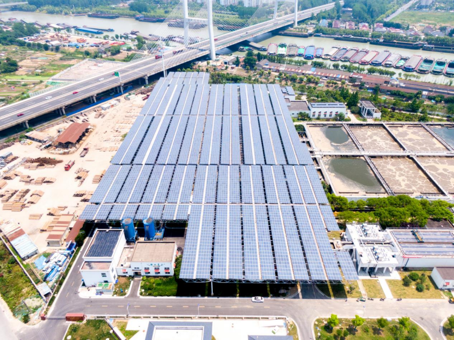 圖注:全國(guó)首批、江蘇首家建成投產(chǎn)的“光伏+水務(wù)”項(xiàng)目(湯汪污水處理廠電站)